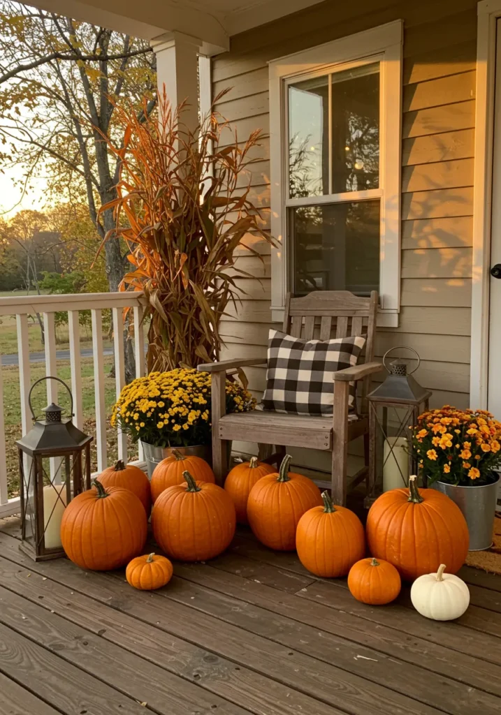 This farmhouse porch feels like pure golden-hour magic. A wooden chair with a black-and-white checkered pillow sits among a cheerful collection of pumpkins, mums, and lanterns. The warm sunset light gives everything a soft, amber glow.