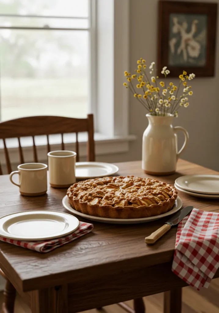 This sweet little farmhouse table feels like the start of a perfect afternoon. A golden pie sits at the center, surrounded by simple cream plates, checkered napkins, and a pitcher of tiny wildflowers. The soft natural light makes everything look warm and welcoming, like a quiet moment before guests arrive.
