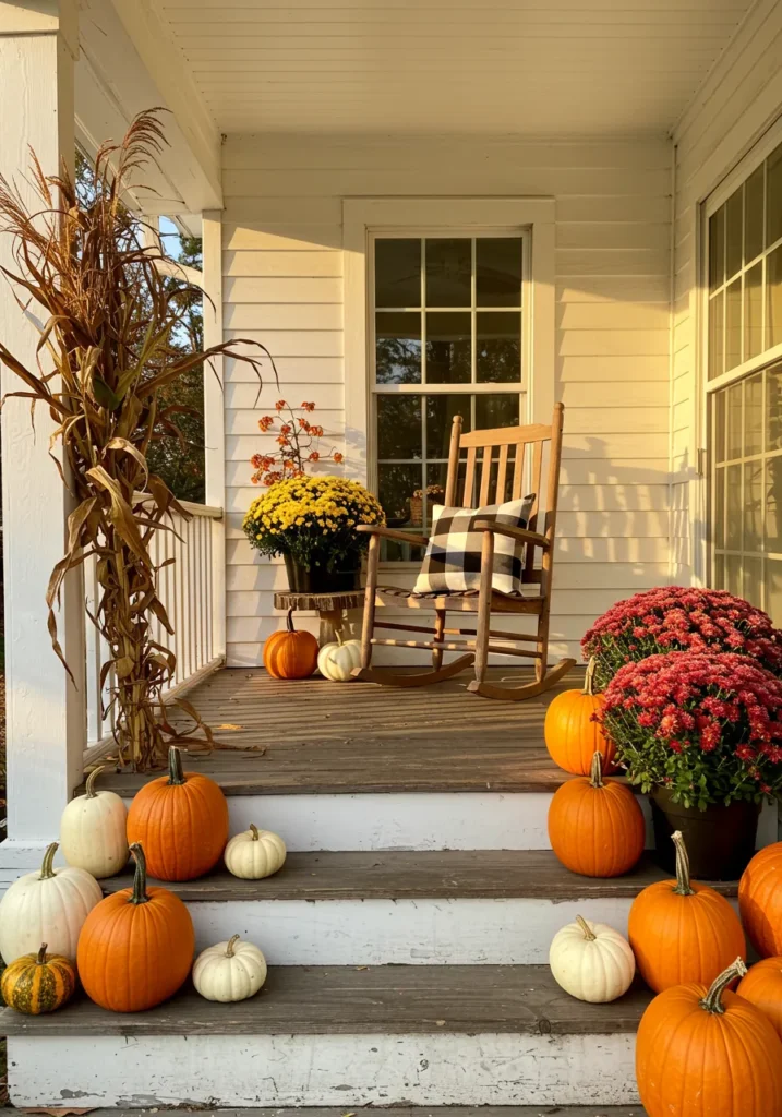 This front porch gives all the cozy fall feelings in one glance. A simple rocking chair with a plaid pillow sits among bright mums and pumpkins of every size. The warm golden light hits the white siding perfectly, making everything feel nostalgic and full of charm.