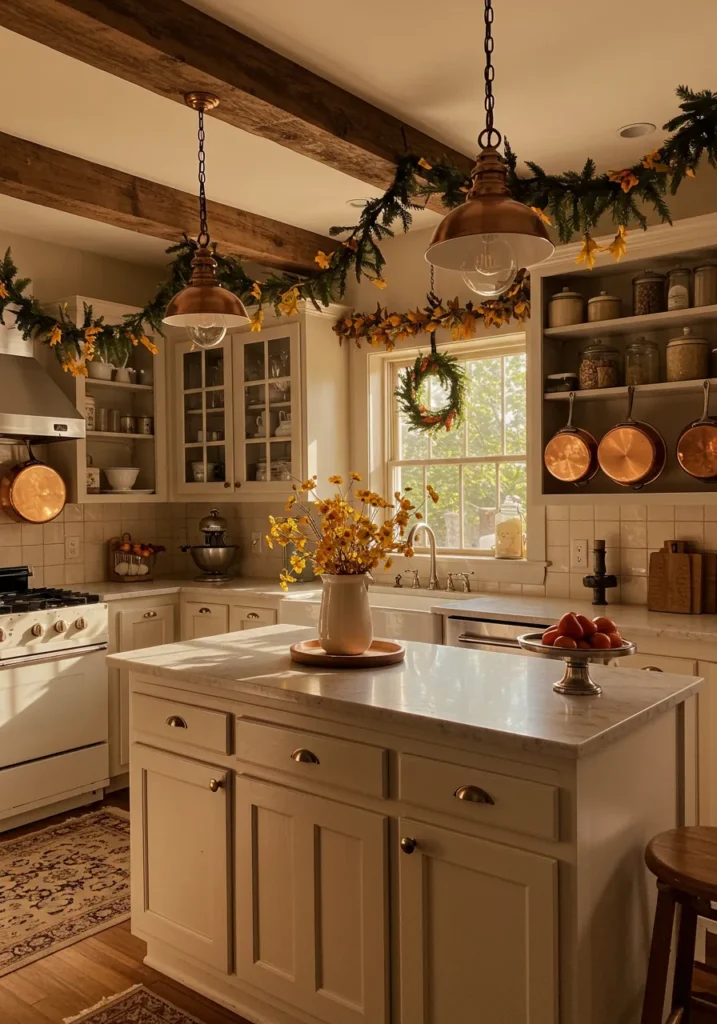 I can’t get over how cozy this looks. The copper and wood combination gives such a lived-in warmth, and the garlands add that festive touch without being too much. It’s the kind of kitchen that makes Thanksgiving prep feel joyful instead of stressful.