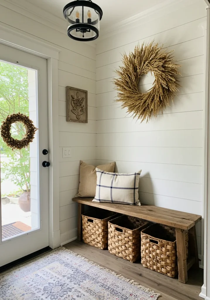 This entryway is all about rustic simplicity. White shiplap walls, woven baskets, and a natural wood bench set the tone, while the wheat wreath adds texture and warmth. The space feels airy and uncluttered, perfect for welcoming guests.