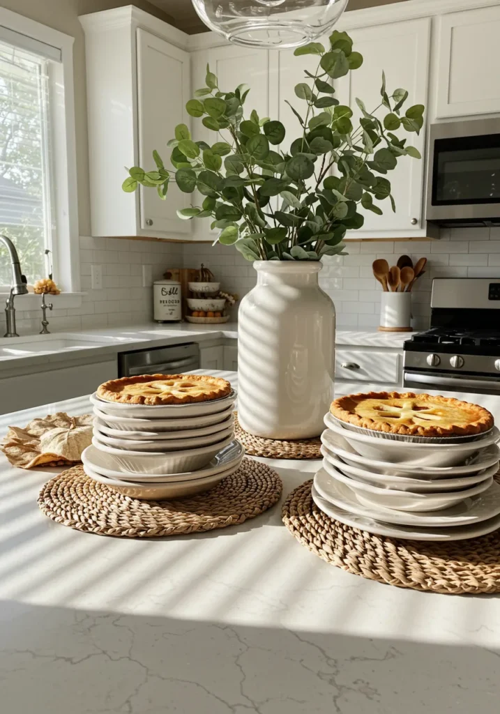 This bright farmhouse kitchen feels like the heart of Thanksgiving itself. Stacks of cream-colored dishes, golden pies, and a tall vase of eucalyptus sit perfectly on woven placemats. The sunlight filters through the window, casting soft stripes across the marble counter and white cabinets. Everything looks warm, simple, and timeless — just how a farmhouse kitchen should.