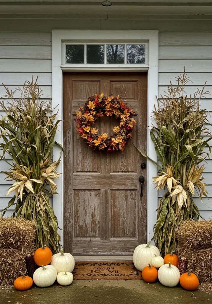 This front door looks straight out of a fall postcard. The weathered wood door is dressed with a wreath of orange and golden leaves, surrounded by corn stalks, hay bales, and a mix of white and orange pumpkins. Everything feels warm, welcoming, and full of that old-fashioned farmhouse charm.