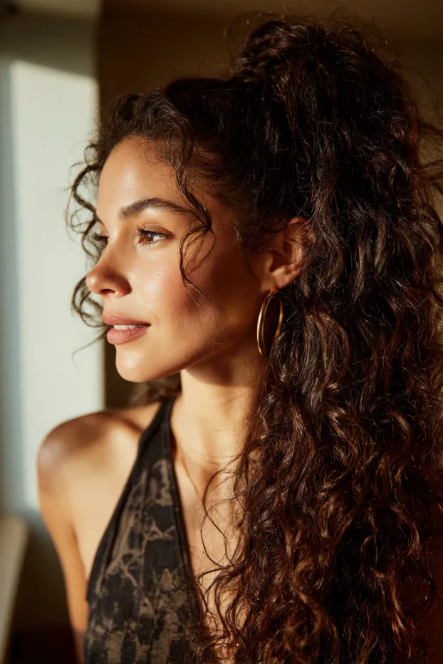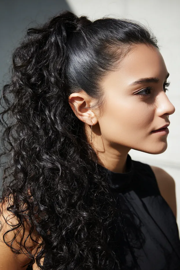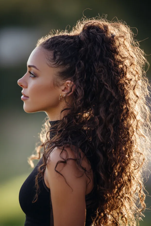 This look features long curly hair pulled into a high ponytail with soft definition and natural volume. Loose strands around the face soften the look while sunlight enhances the texture and shine.