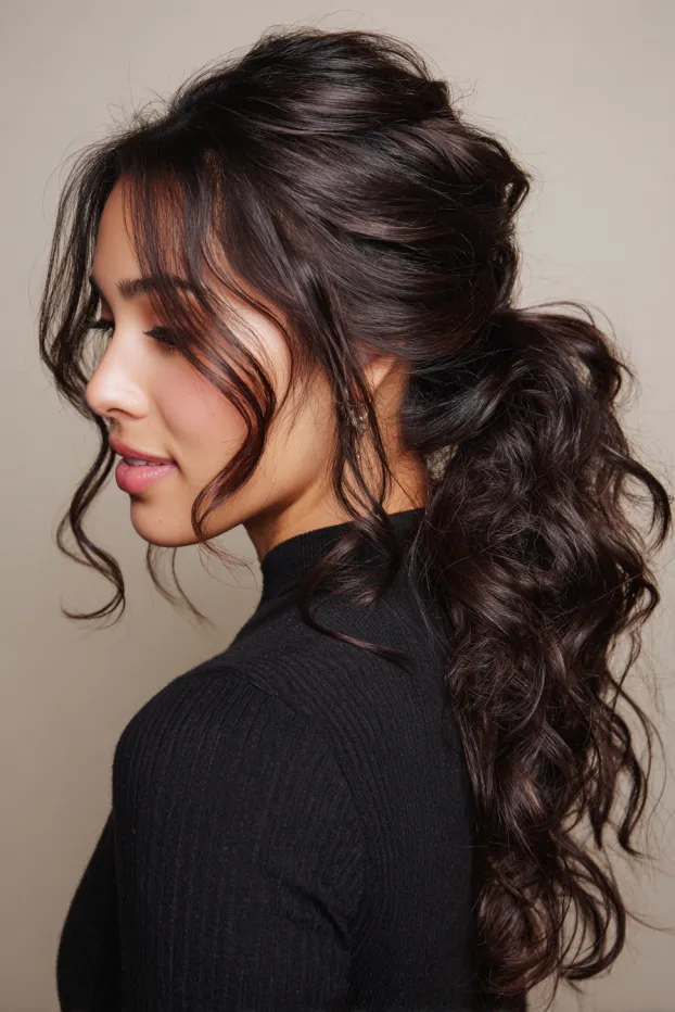 This hairstyle features long dark brown hair in a softly styled ponytail with loose curls and layered pieces around the face. The volume sits gently at the back while the front stays airy and light.
