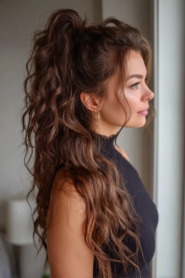 This look shows long brown hair styled into a mid to high ponytail with loose, natural waves and soft texture. A few wispy strands frame the face, giving it that effortless, slightly undone feel.