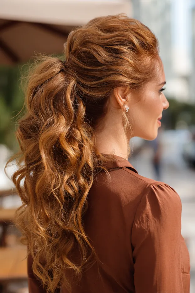 This look shows long auburn hair gathered into a mid to high ponytail with natural waves and a slightly tousled texture. The curls are loose and airy, giving the ponytail a soft and effortless shape.