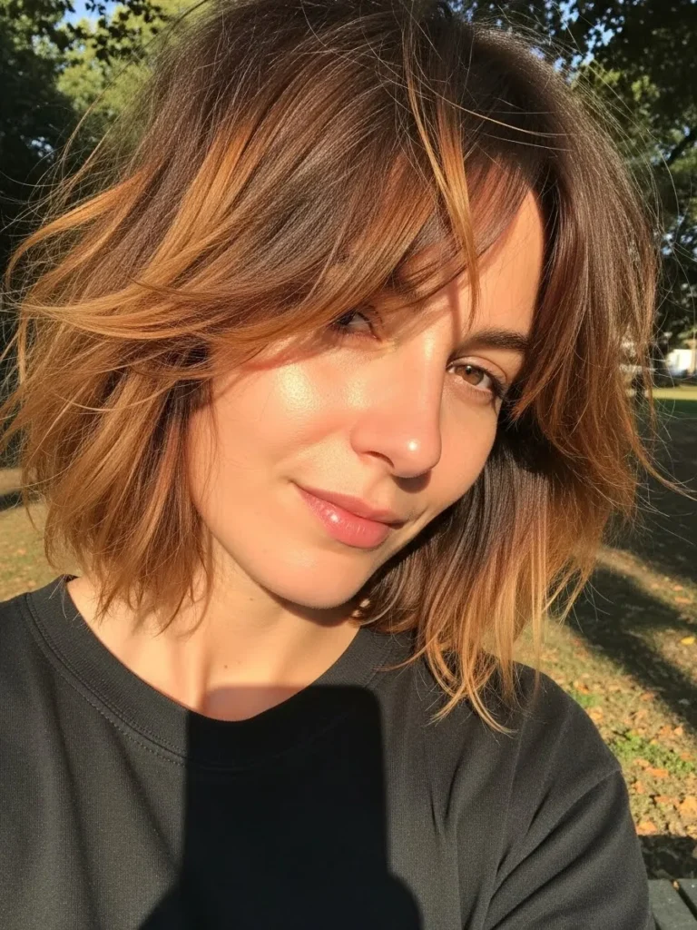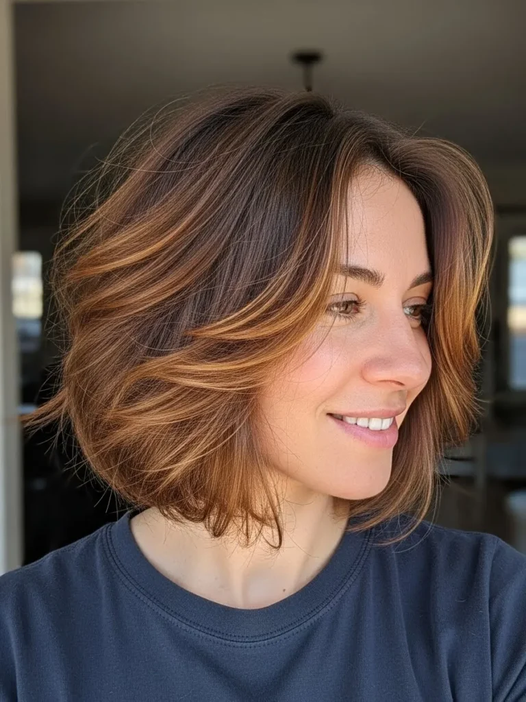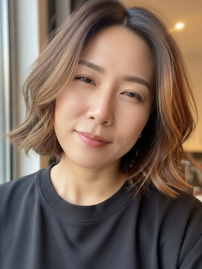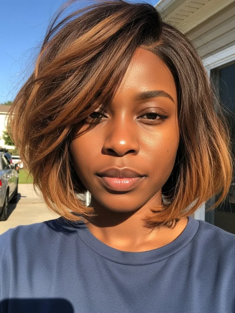 I love how energizing this style feels on me. The texture keeps things lively and the caramel pieces brighten my skin tone in the nicest way. It is the kind of bob that makes me look more awake even on mornings when I definitely am not.