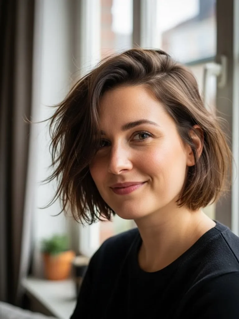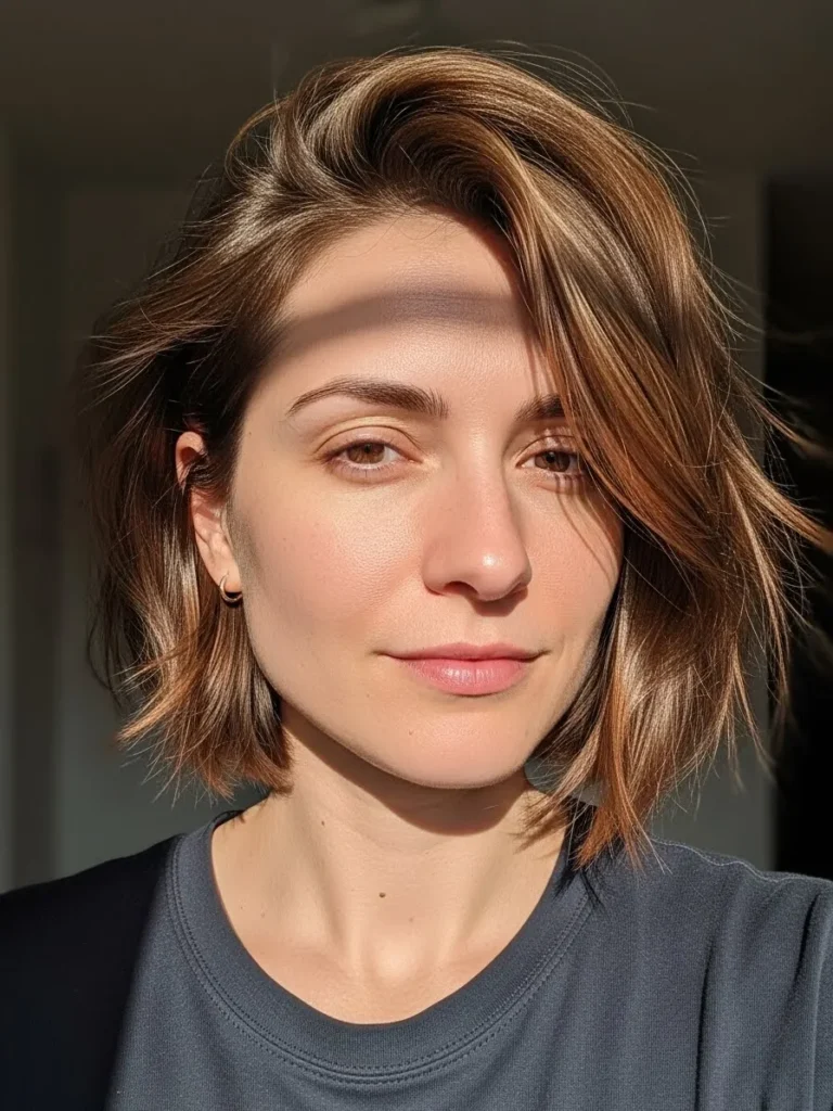 This chin length bob has a tousled side sweep that gives it instant volume and a relaxed modern feel. The soft choppy layers create movement while the subtle caramel pieces blend through the mid lengths for a warm lived in look. It feels easy and natural with just the right amount of texture.