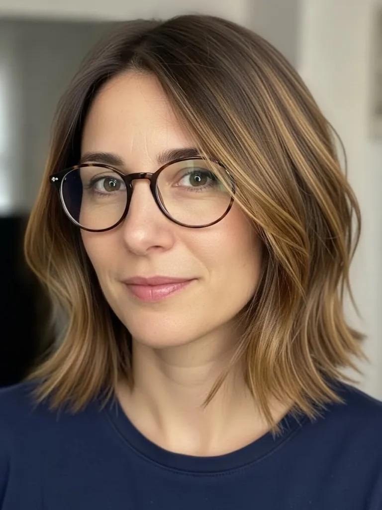 This bob lands around the collarbone with gentle choppy layers that soften the overall shape. The caramel ribbons are subtle yet brightening especially around the face where they catch the eye behind the glasses. The texture stays smooth with just the right amount of movement in the ends.