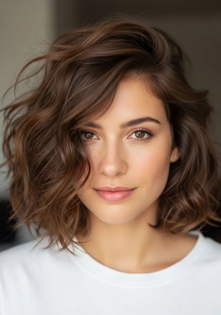 This wavy bob sits just above the shoulders with loose curls that catch the light in the prettiest way. The layers are soft and airy which gives the whole look that effortless movement we all secretly hope for. The color is a warm brunette with subtle highlights that frame the face and make every curl look a little more alive. The overall style feels relaxed yet polished which is such a sweet spot for everyday beauty.