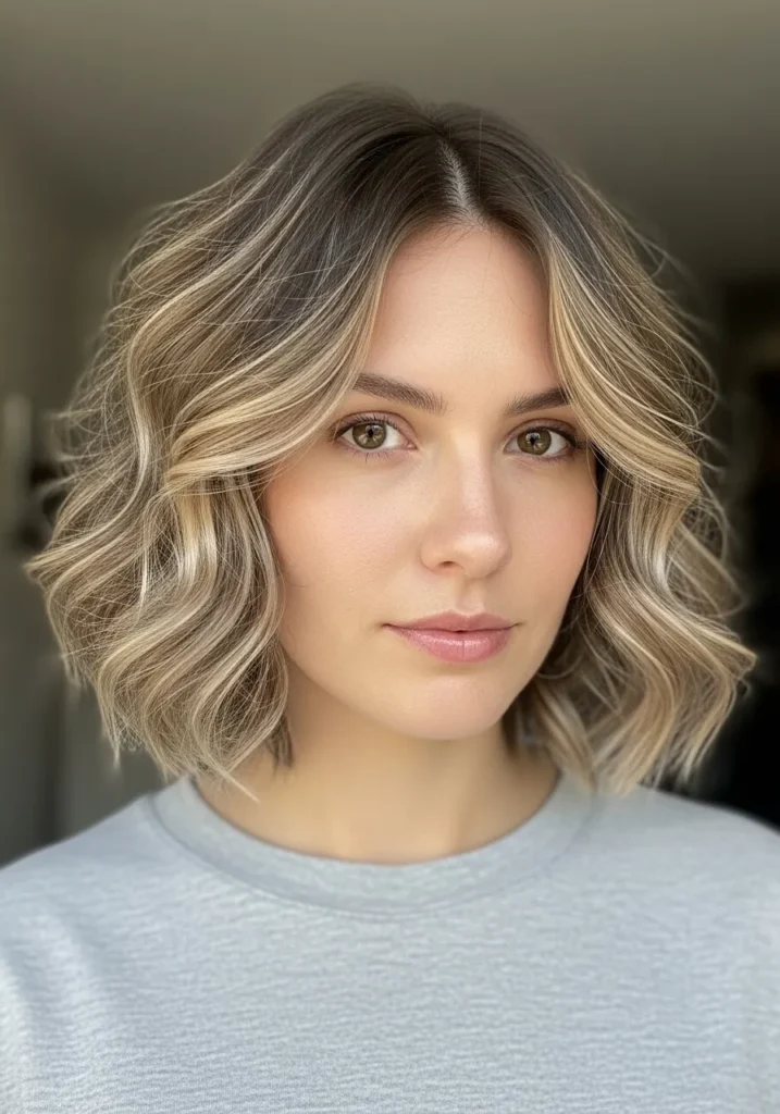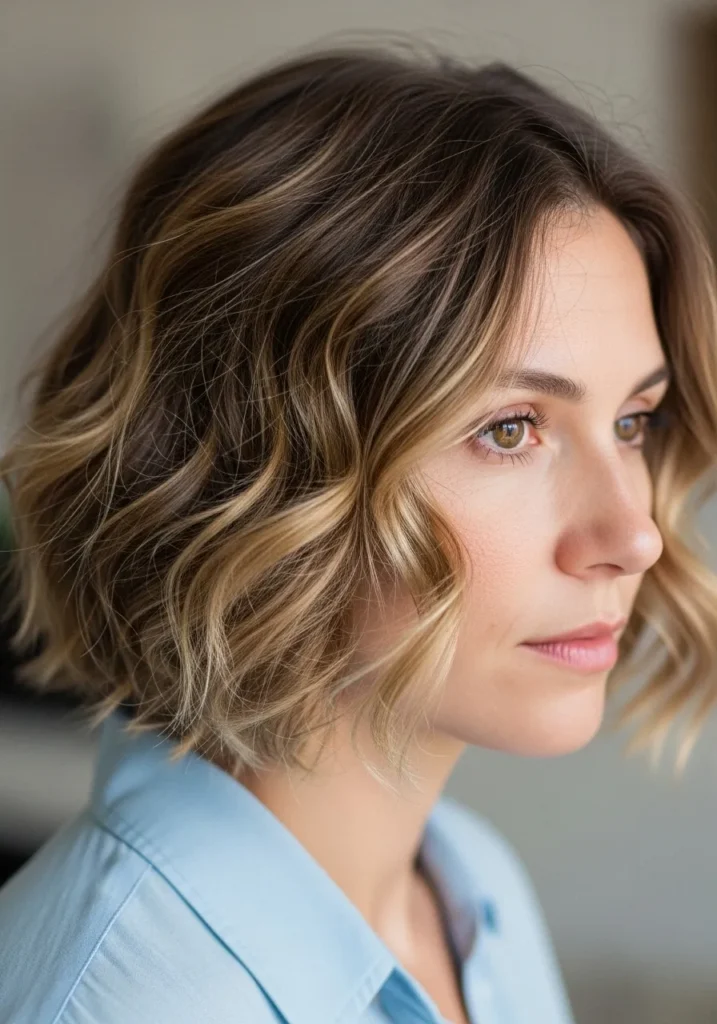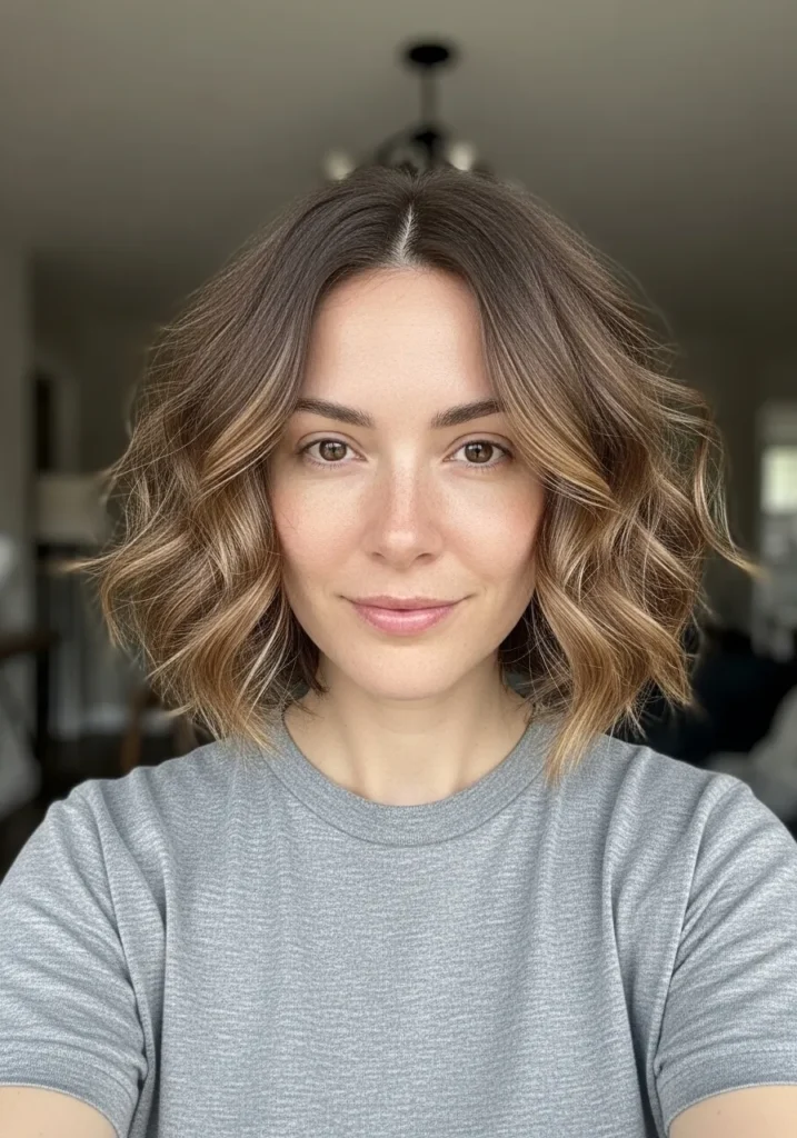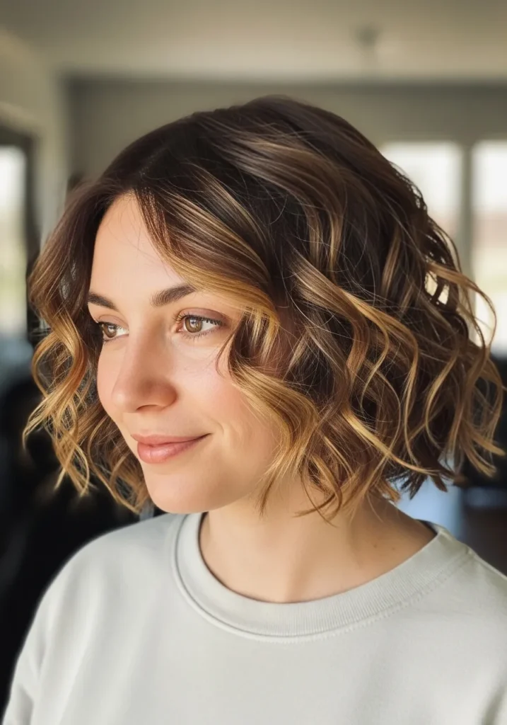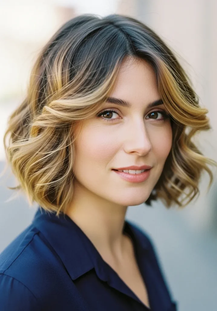 This soft wavy bob sits right at the jawline with loose textured waves that look effortlessly touchable. The layers are light and airy, giving the curls room to sway without feeling too styled or rigid. The color blends warm brunette roots with buttery blonde highlights that frame the face in the prettiest way. Everything about this look feels soft and natural with just enough movement to make it feel modern.