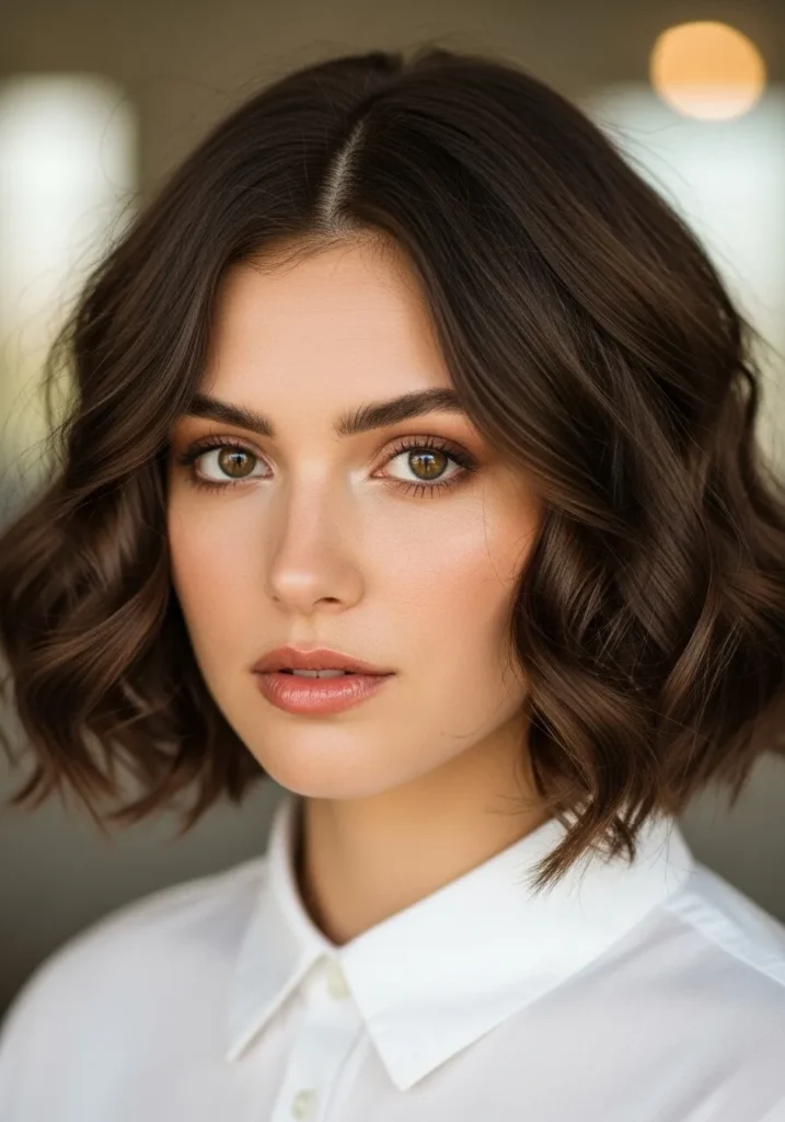 This wavy bob sits just above the shoulders and has that perfectly undone texture that looks effortless but still super polished. The waves are soft and airy with light layering that gives the whole look a breezy shape. The color is a warm chocolate brown that catches the light beautifully and adds a natural glow. The side part creates a gentle sweep across the forehead that frames the face in the prettiest way.