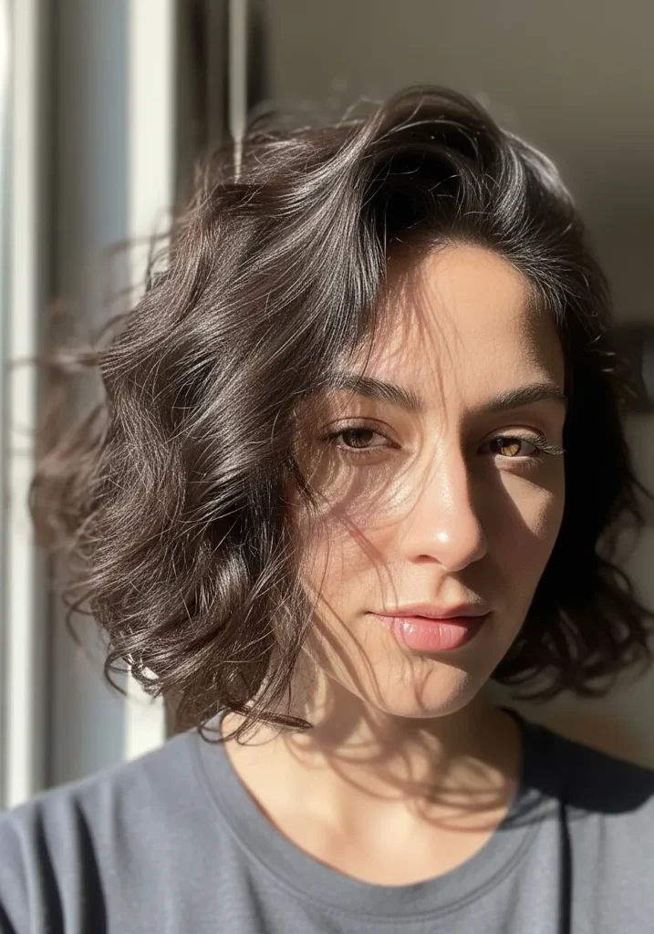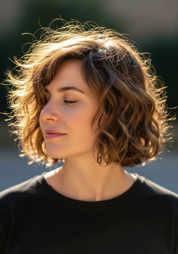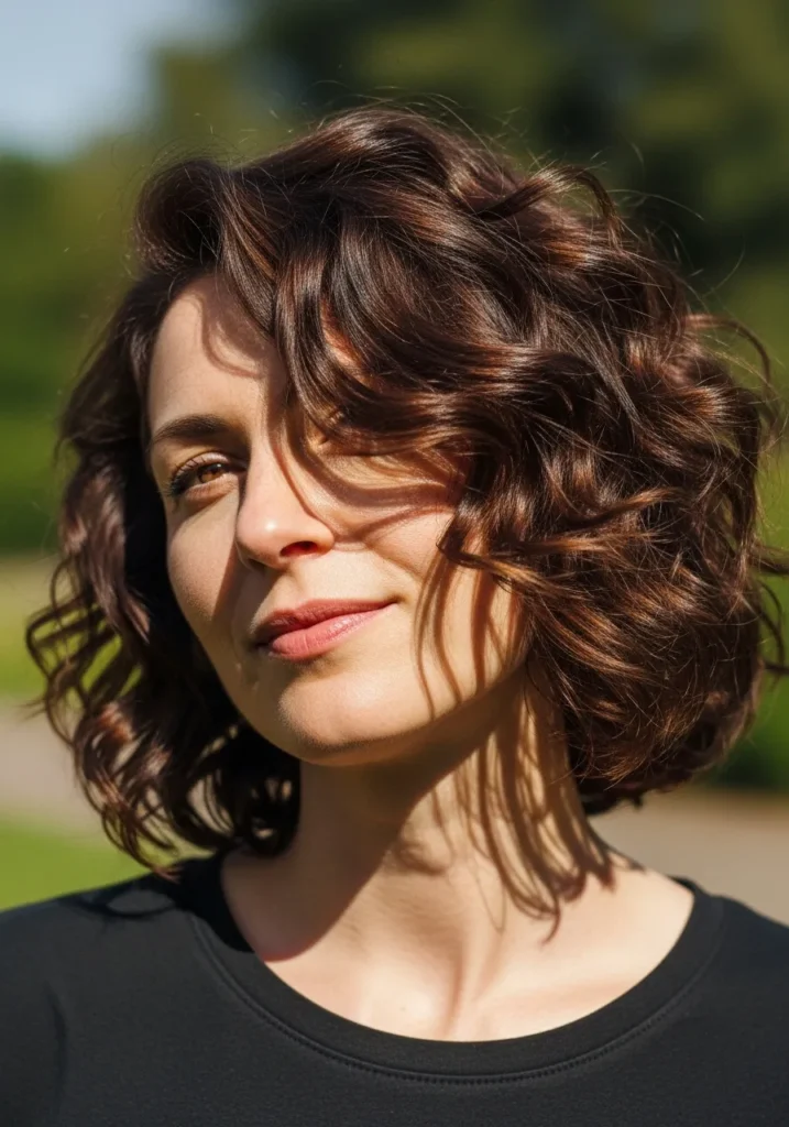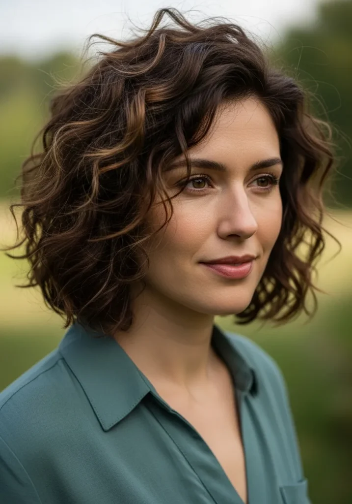 This wavy curly bob sits right around the chin and plays with a gorgeous mix of loose bends and soft ringlets. The layers are light and airy which lets the curls move without feeling bulky. The warm brunette shade adds a natural glow that looks lovely in any light. Everything about this style feels relaxed and slightly undone which gives it that effortless beauty moment we all secretly want.