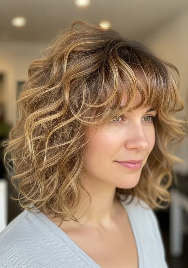 I love how this style feels equal parts playful and polished. The curls add instant personality and movement, and the caramel highlights make the whole look feel warm and flattering against the skin. It is one of those hairstyles that makes me feel instantly put together even on low-effort days because the shape does so much of the work for me. It is soft, feminine, and just a little bit flirty in the best possible way.