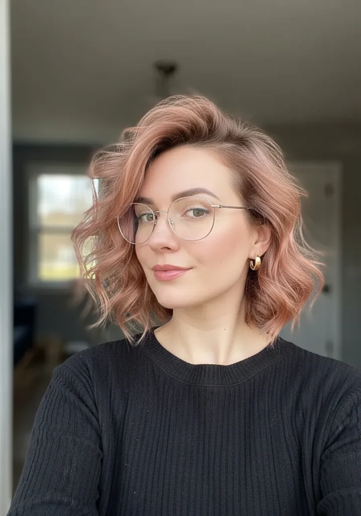 I love how this kind of wavy bob instantly perks up my whole look without asking for much effort. The waves make my face look brighter and more lifted and the rose gold shade adds a little charm even on my lazy hair days. I also like that it feels polished but still relaxed which means it works for busy mornings or those days when I want to look cute without overthinking anything.