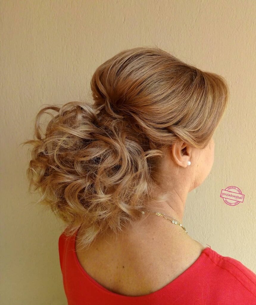 This style gathers medium-length hair into a large, textured low bun that sits right at the nape. The warm honey blonde color highlights the layered structure, while a generous amount of lift at the crown creates a beautiful, rounded silhouette. Each strand is curled and pinned loosely to achieve that perfectly undone, airy look that feels light and full of life.