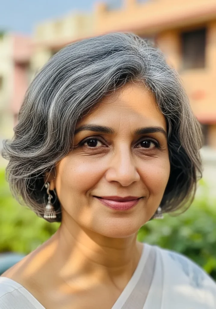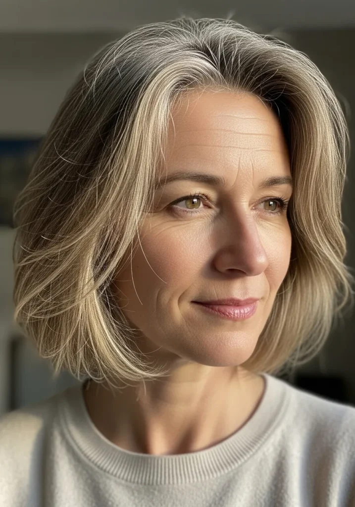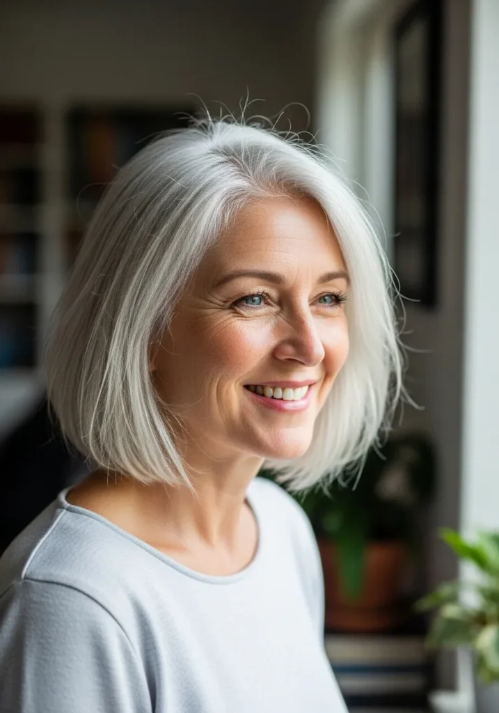 I always feel confident with a cut like this. The gentle shape around my face feels smoothing and the silver color looks elegant without losing warmth. It has that calm, refined look that still feels modern.