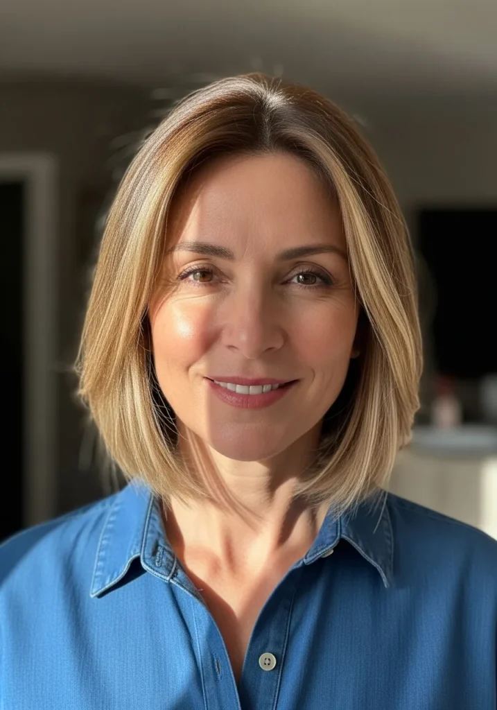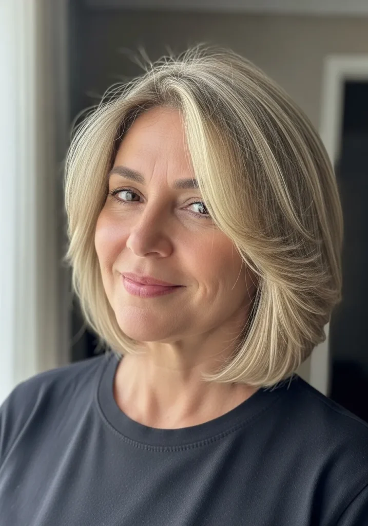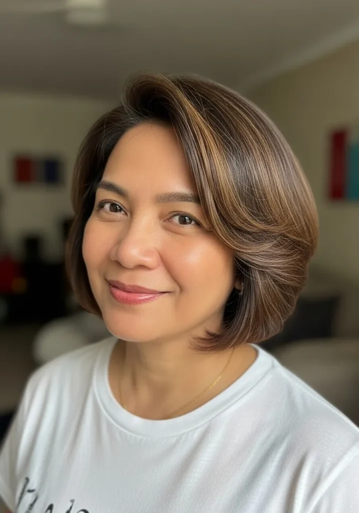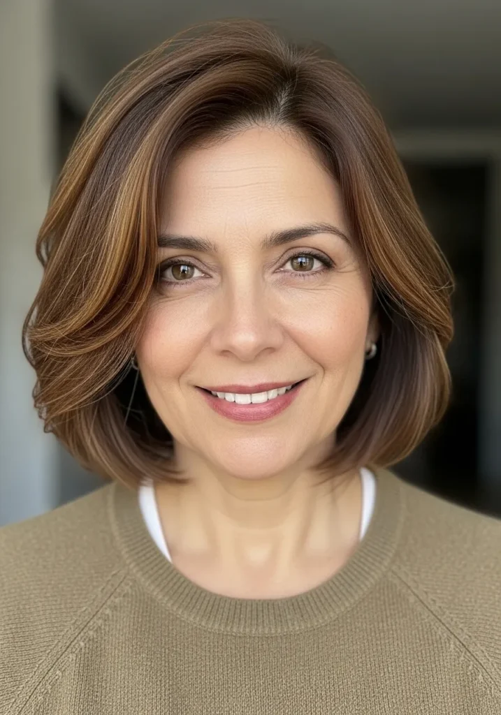 I enjoy bobs like this because the layers give such a soft lift around my cheeks. The feathering keeps everything light, which always makes me feel a little younger and a whole lot more put together. It is easy, flattering, and always fresh.