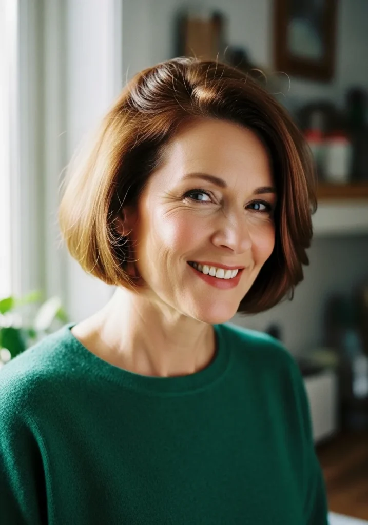 I feel so tidy with a haircut like this. The clean lines make everything look fresh, and the warm color lifts my complexion. It is the kind of bob that feels timeless and always flattering no matter the outfit or season.