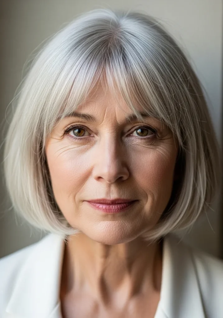 This chin-skimming bob has a smooth shape with airy movement through the ends. The fine silver strands fall softly around the cheeks and the fringe blends gently into the rest of the cut. The texture stays light and natural which keeps the whole style soft and flattering.