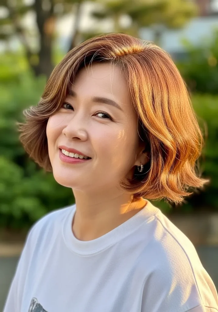 This short wavy bob has soft curls that wrap gently around the sides. The copper brown tone catches the light in a warm bright way. The texture stays loose and natural which keeps the style youthful.