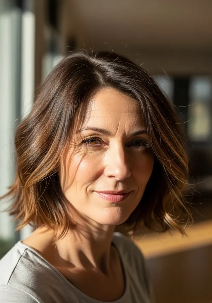 I enjoy styles like this because they feel lived in while still polished. The highlights catch the light in such a flattering way and the soft texture helps my face look lifted. It is one of those cuts that works even on days when I only have a minute to get ready.